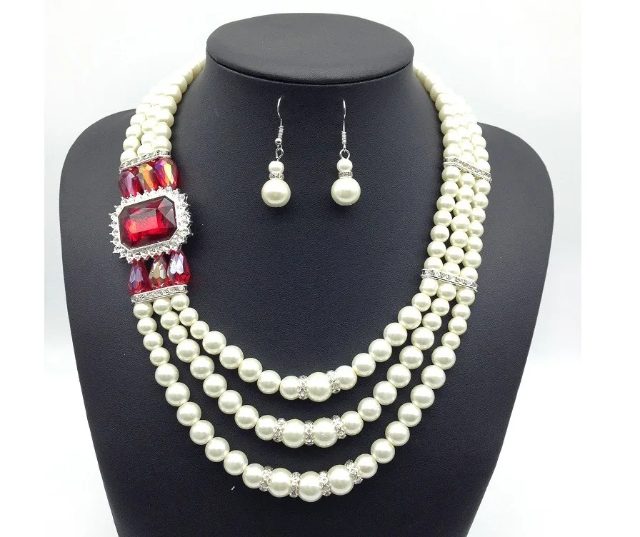 HOT SALE Fashion multi layer Pearl Crystal Necklace Earrings exaggerated Jewelry Set mujer Nobility Lucky wo